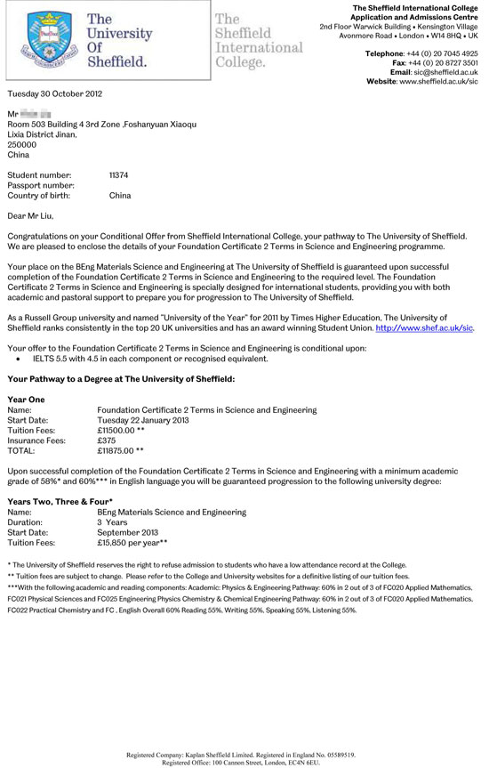 录取结果:英国谢菲尔德大学,半年预科,生物材料学专业